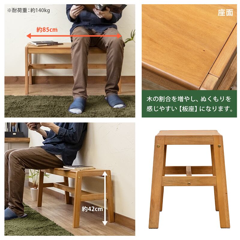 軽くて丈夫、使い込むほど深みのある色へ変わるマホガニー材のベンチです