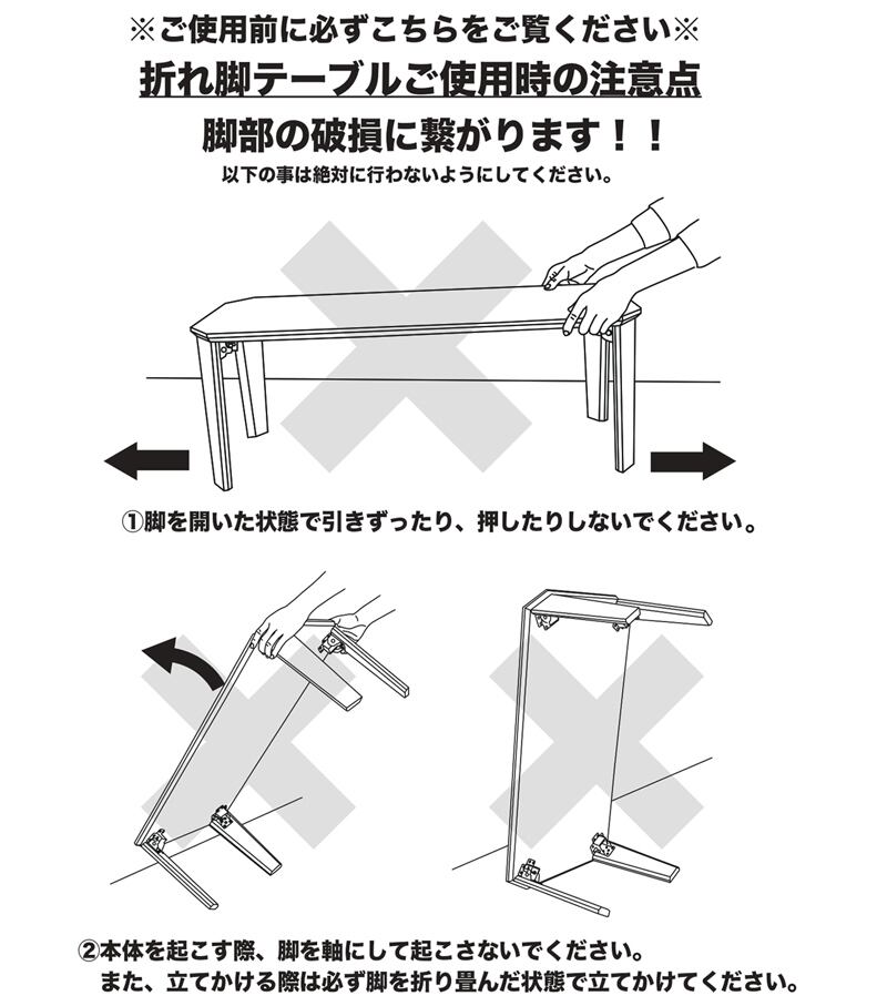 ●テーブルを押したり、引きずると脚が取れてしまう可能性がございます。移動の際は必ず持ち上げて下さい。